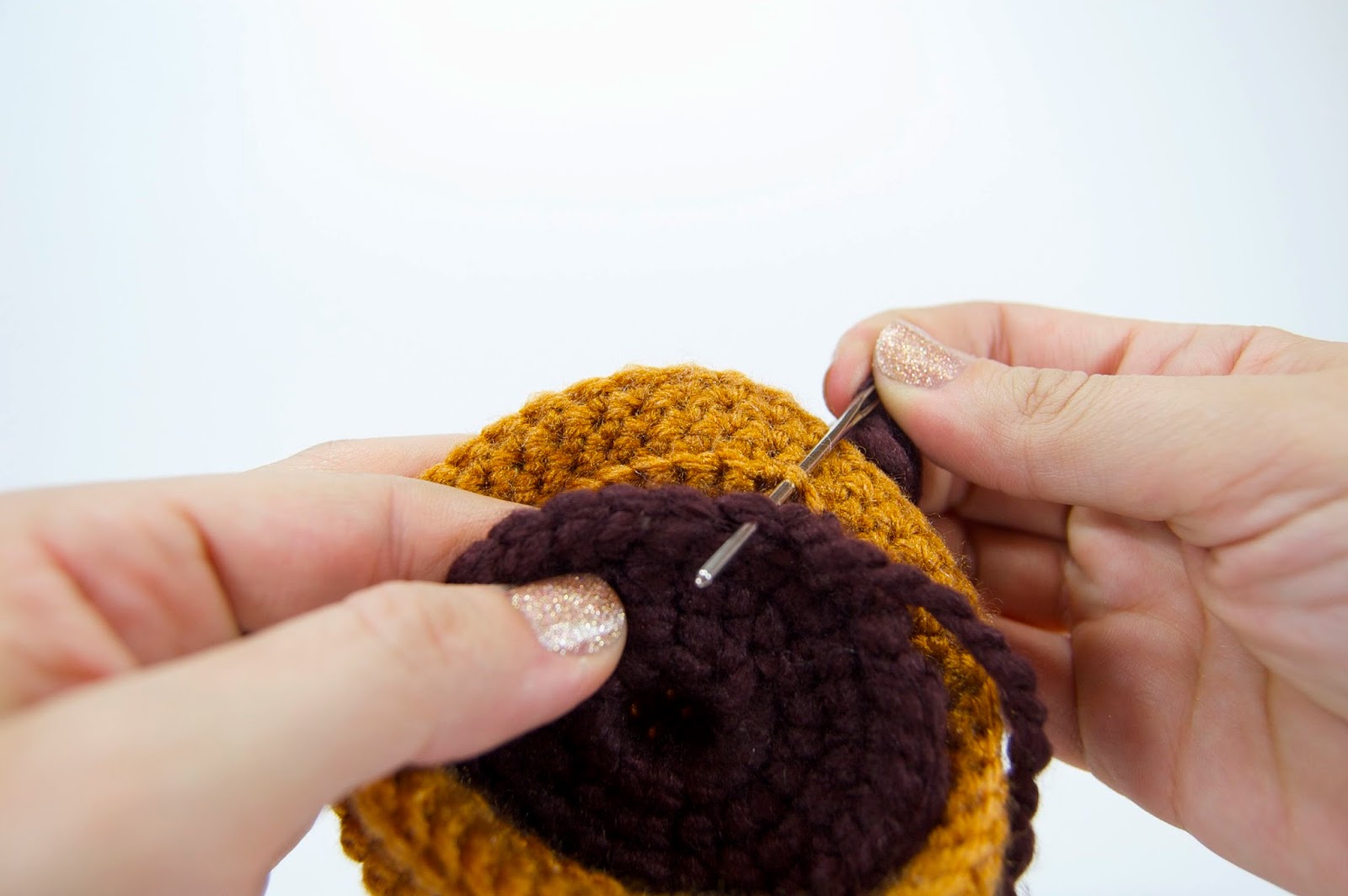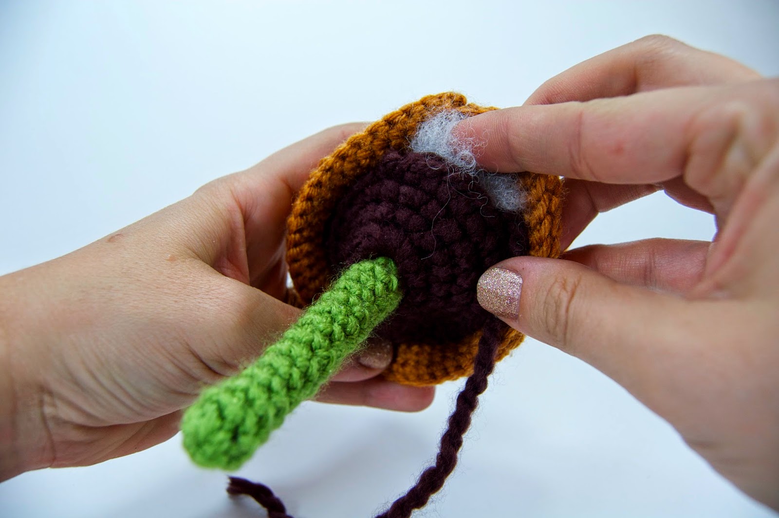 Thread the tail from the Dirt piece onto your tapestry needle. Sew Dirt into Pot along unused back loops of Rnd 16, leaving a 2-3" opening. Insert polyester fiber-fill stuffing into the pot, small pieces at a time, filling in the outer area and leaving the middle of the pot less filled in. Insert the Stem from the inside of the hole in the center of the Dirt, out through the top. Push it down into the Pot, clearing a path through the stuffing so it will rise and lower easily. Finish closing the opening you left while sewing in the Dirt.